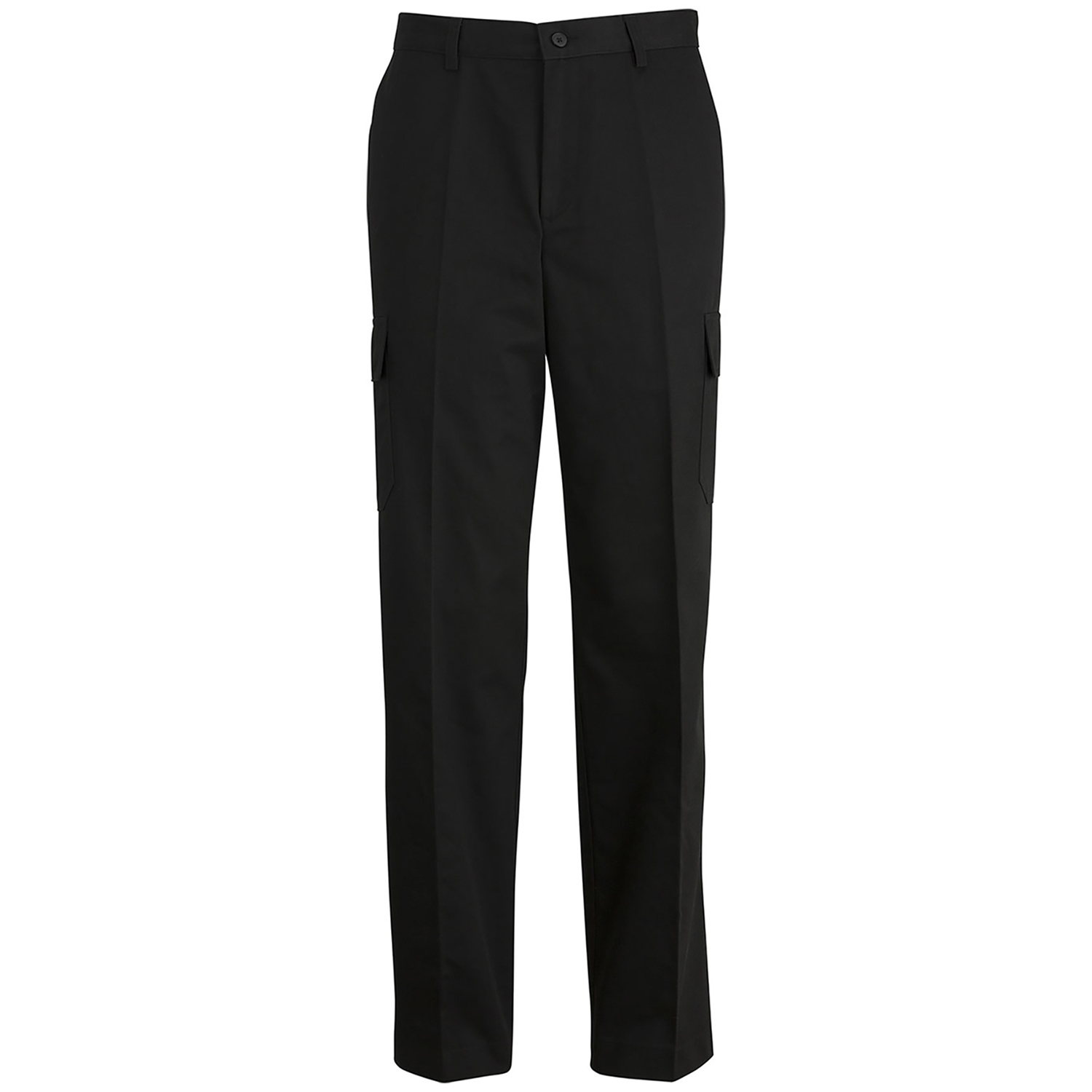 - Flat front, button closure and brass zipper
