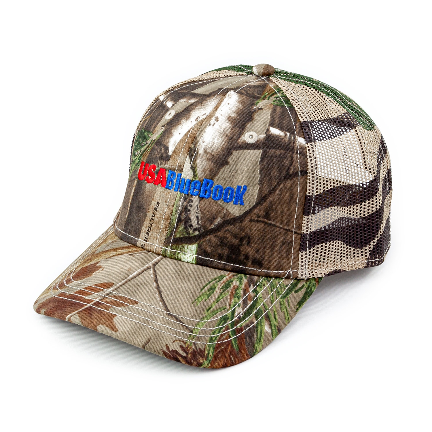 Medium profile six panel structured cap. Chino twill or camouflage twill with trucker mesh back. Screen printed American flag on mesh. Fabric strap with two piece hook & loop closure.